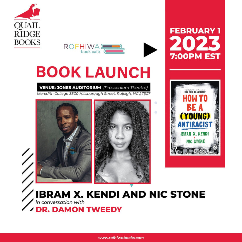 Please join us for the launch of How to Be a (Young) Antiracist with co-authors Dr. Ibram X. Kendi and Nic Stone in conversation with Durham based author and psychiatrist, Dr. Damon Tweedy. Based on the adult bestseller by Ibram X. Kendi, and co-authored by bestselling author Nic Stone, How to Be a (Young) Antiracist is a dynamic reframing of the concepts shared in the adult book, How to Be an Antiracist, with young adulthood front and center. This is an in-person, offsite event, presented by Rofhiwa Book Cafe in partnership with Quail Ridge Books.