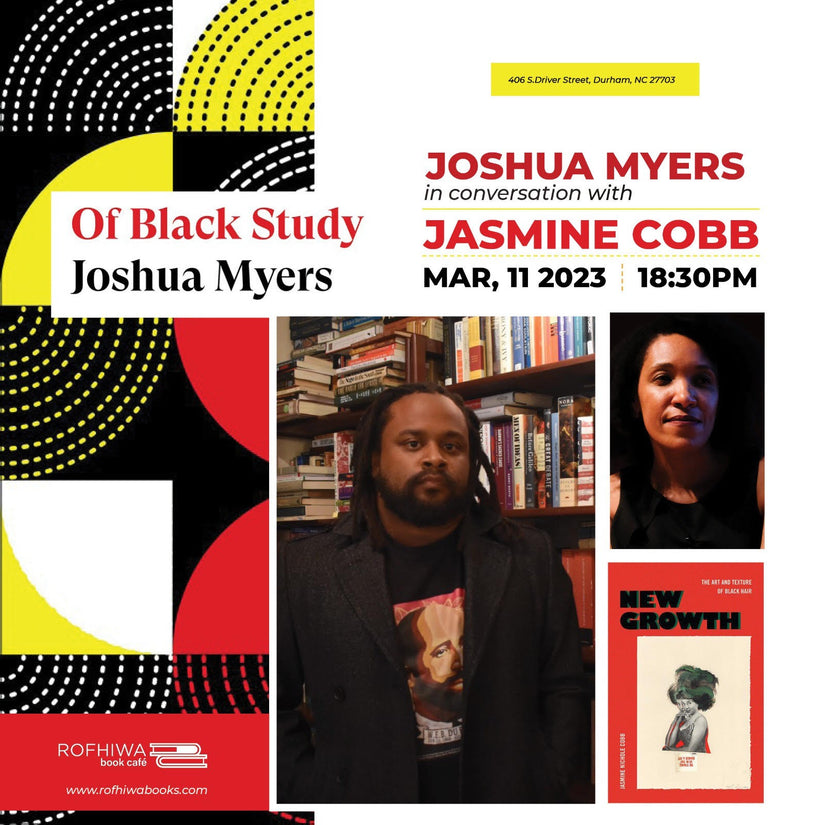 We are thrilled to host Joshua Myers, author of Of Black Study, which explores the ideas of Black intellectuals who created different ways of thinking and knowing in their pursuit of freedom. Please join us as Joshua Myers, talks to Jasmine Cobb, author of New Growth: The Art and Texture of Black Hair which traces the history of Afro-textured coiffure as a visual material through which to reimagine the sensual experience of Blackness. This is an in-person event.